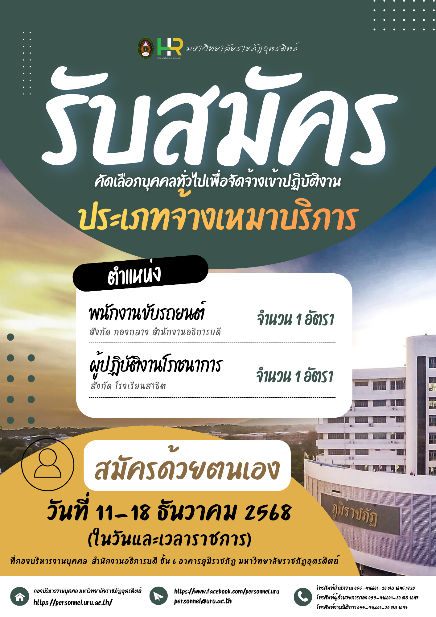 ประกาศมหาวิทยาลัยราชภัฏอุตรดิตถ์ เรื่อง รับสมัครคัดเลือกบุคคลทั่วไปเพื่อจัดจ้างเข้าปฏิบัติงาน ประเภทตำแหน่งจ้างเหมาบริการ ปีงบประมาณ 2569