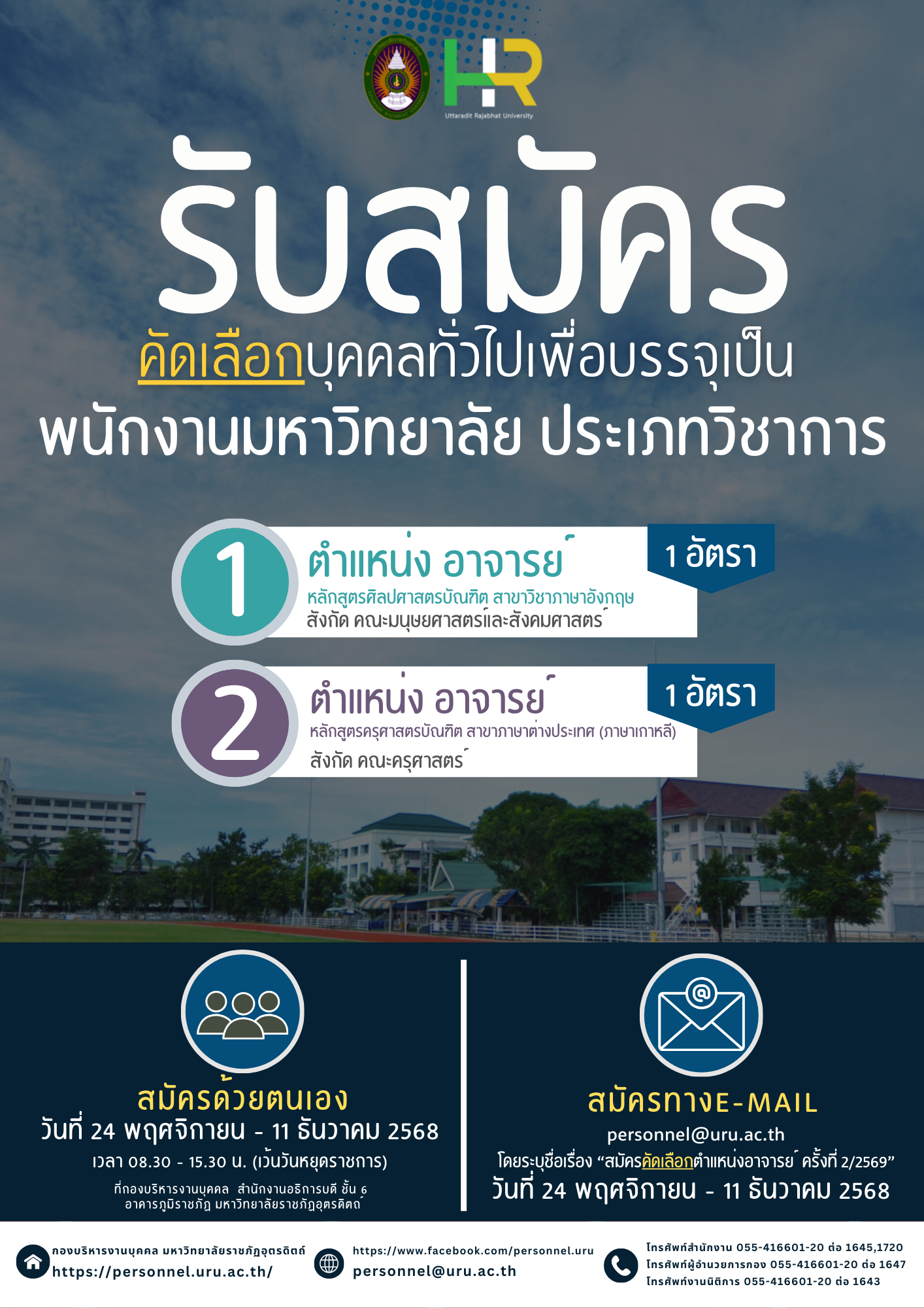 ประกาศมหาวิทยาลัยราชภัฏอุตรดิตถ์ เรื่อง รับสมัครคัดเลือกบุคคลทั่วไปเพื่อบรรจุเป็นพนักงานมหาวิทยาลัย ประเภทวิชาการ ครั้งที่ 2 ปีงบประมาณ 2569