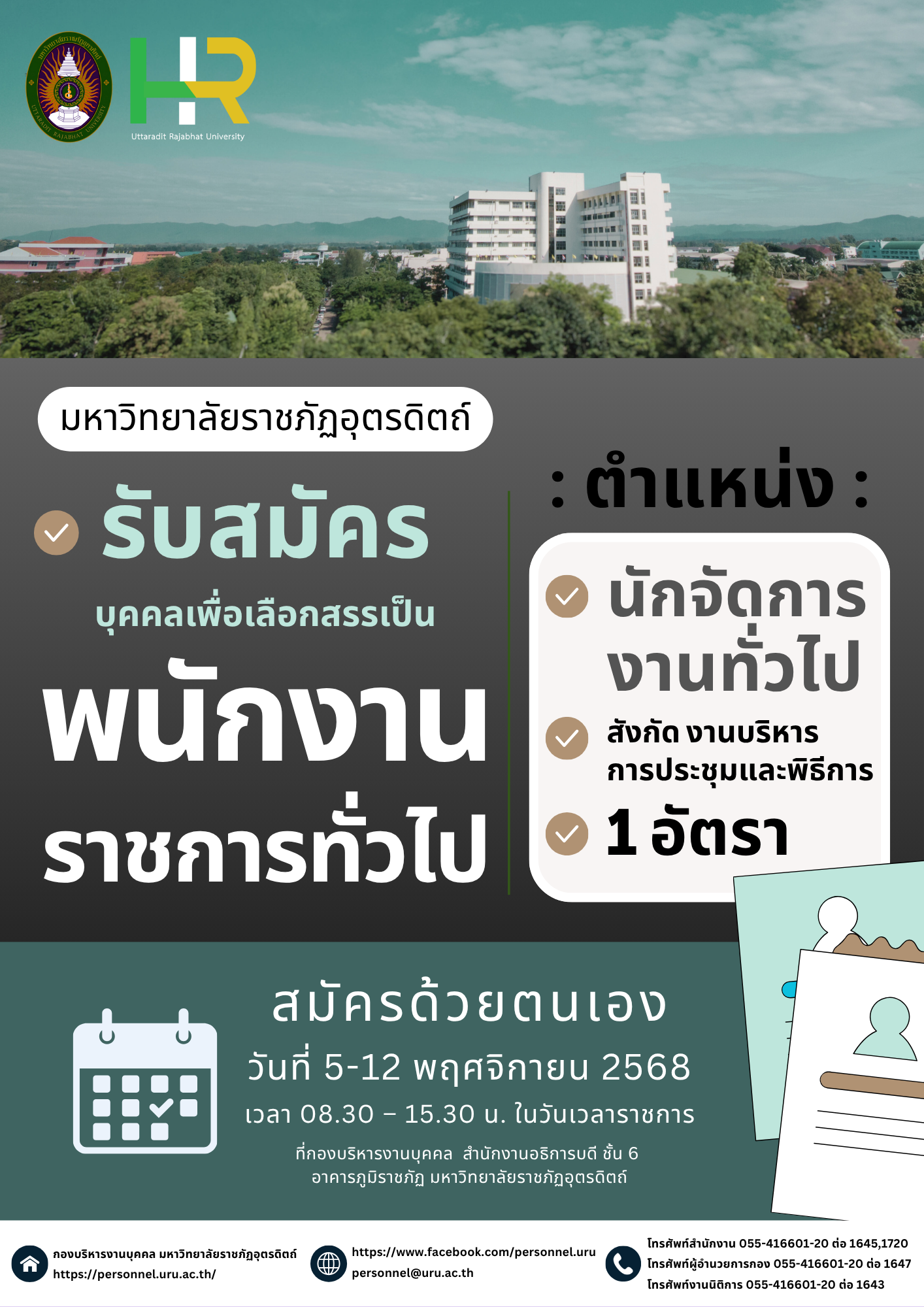 ประกาศมหาวิทยาลัยราชภัฏอุตรดิตถ์ เรื่อง รับสมัครบุคคลเพื่อเลือกสรรเป็นพนักงานราชการทั่วไป ประจำปีงบประมาณ 2569